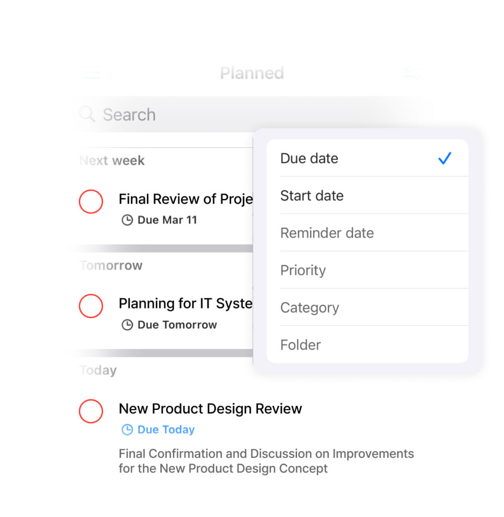 Customize how you tackle your to-do list with options to group and sort tasks by expiration date, start date, and priority, offering a personalized approach to productivity.