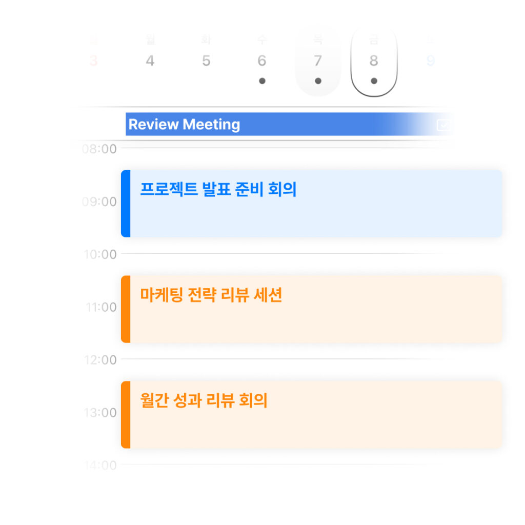 회의, 약속, 할 일, 중요 메일 등 업무 및 개인 일정을 하나의 앱에서 편리하게 관리할 수 있습니다.